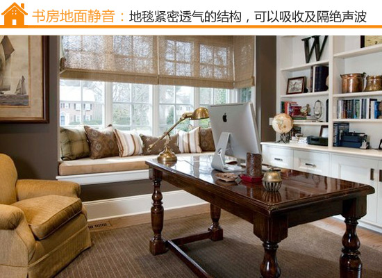 书房静音,窗户是关键。可以将书房的普通玻璃换成隔音玻璃,双层玻璃的隔音效果在40%左右;而三层玻璃则几乎百分百隔音。同时使用密闭性能好的塑钢窗,可以使室内噪音降低到室外的1/3。