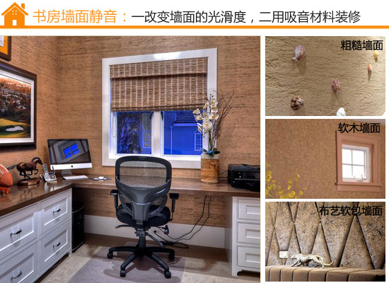 安静对于书房和卧室来讲是十分必要的,因为人在嘈杂的环境中读书、睡觉、工作效率要比安静的环境中低得多。所以书房和卧室装修的时候从材料选购到装修施工都要贯彻这一原则。具体来说,让书房密不透“音”!